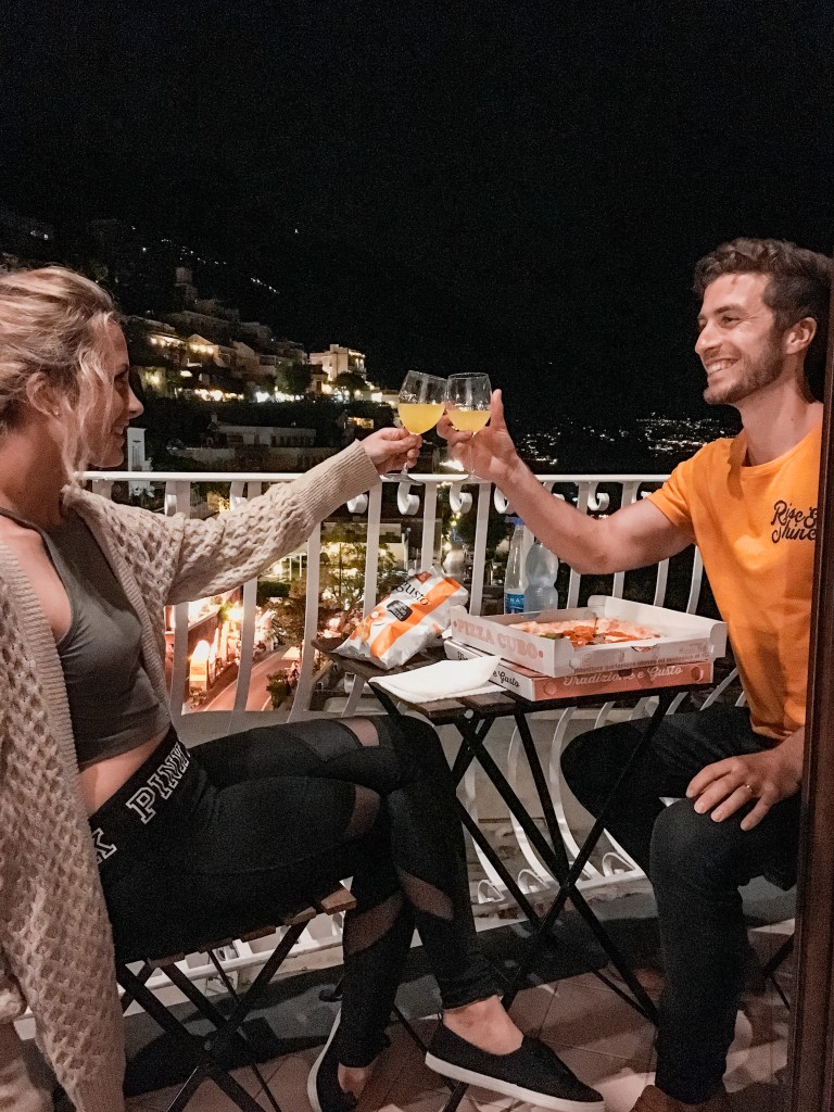 Our room was spacious, had a beautiful black tile shower with the best water pressure we’d had the whole trip, and a balcony overlooking the entirety of Positano. Here we sat late nights after a day out in the sun, eating the prior day’s cold pizza with a glass of limoncello, listening to street musicians as they serenaded the patrons of nearby restaurants.