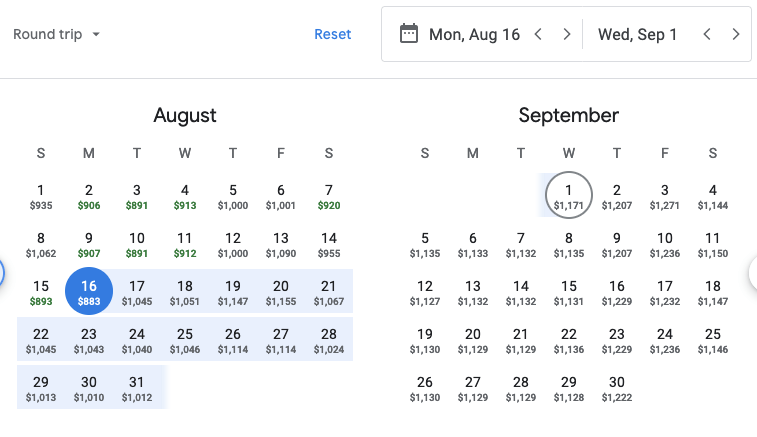 Google is also awesome because they’ll always have a price graph that tells you if the dates prices are normal or not for that time of year. From this, you should be able to choose your dates.