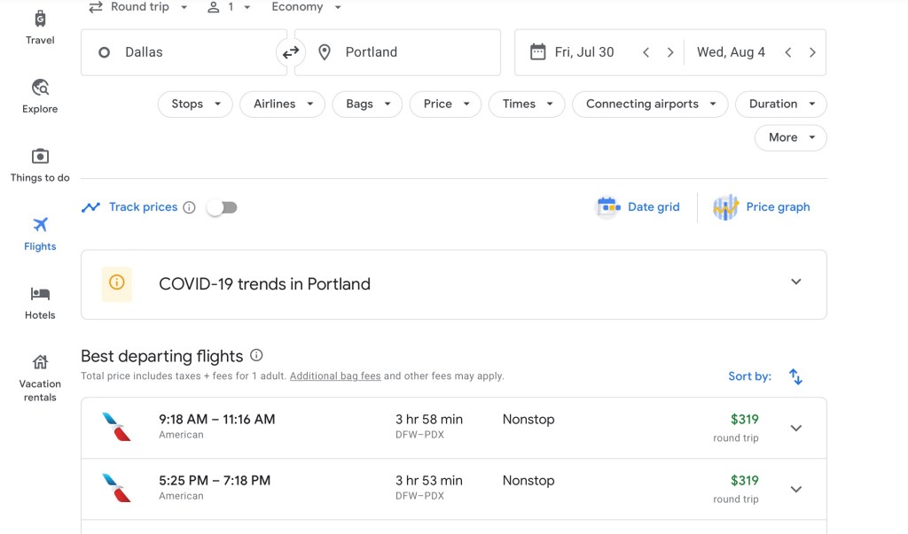 If you google “flights from BLANK to Portland” google will show you flight results that look like this: