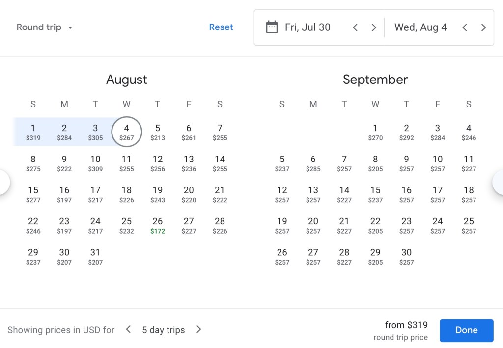 This is how we usually pick our dates. It’s showing you the cheapest option you’ll have for the round trip. Sometimes that lowest price is for a lower company like Spirit or Frontier so prices will go up from there, but it can also show you cheaper date trends.
